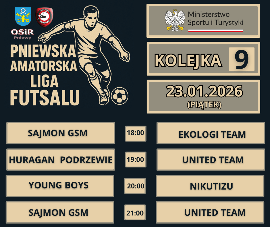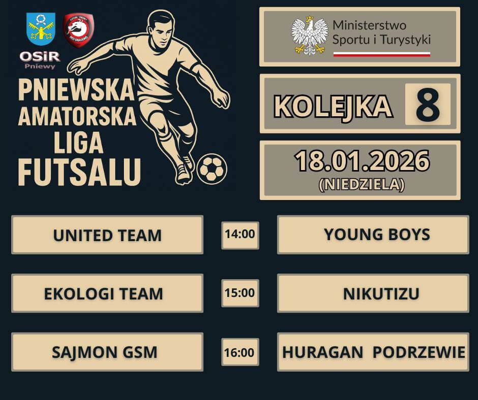 Do końca Pniewskiej Amatorskiej Ligi Futsalu pozostały 3 kolejki. Najbliższą – 8 kolejkę rozegramy w niedzielę 18 stycznia. Następne gramy już tylko w piątki.